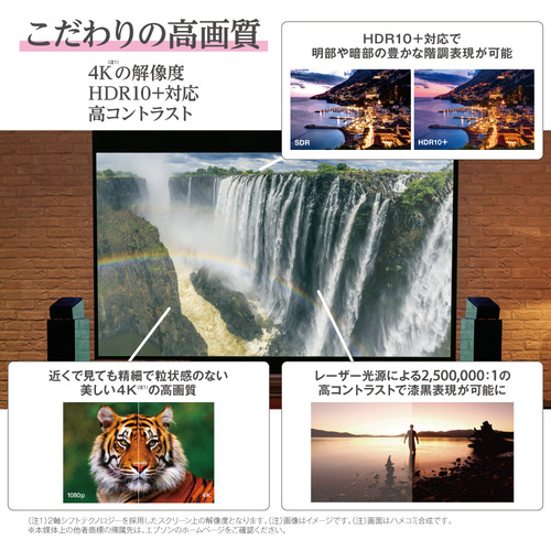 3LCD方式とレーザー光源による、色彩表現豊かで明るく、高コントラストな映像。2軸シフトテクノロジーによる4Kにより、近くで見ても精細で粒状感のない美しい映像を実現。