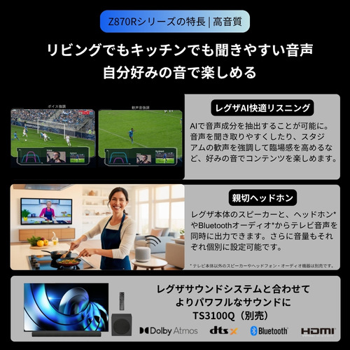 ●聞きやすい音声、臨場感、迫力のサウンドなど、好みの音で楽しめる「レグザAI快適リスニング」