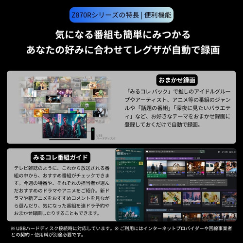 あなたの好きなタレントやジャンルの番組から、ネット動画やシーン、CMまで一覧で見られます。また、おまかせ録画を設定すると予約なしにまるっと自動録画!