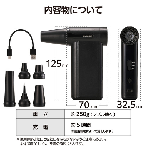 内容物:電動エアダスター本体、噴射ノズル、極細ノズル、大口径噴射ノズル、エアーノズル、大口径エアーノズル、USB-A - USB Type-C(TM)ケーブル、収納袋
