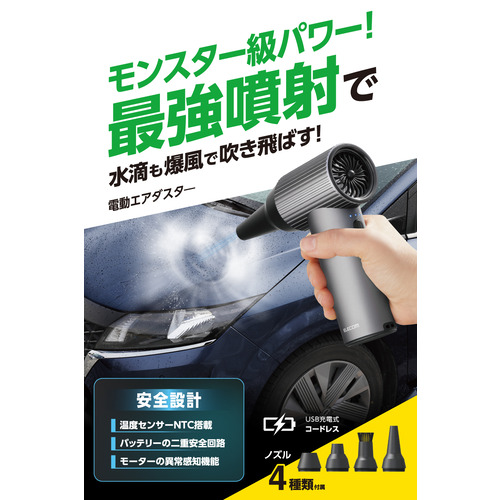 ●ハイクラスな風圧で、洗車後の車全体の水滴やDIY作業で出た切りくずを一気に吹き飛ばし、手軽に掃除できます。