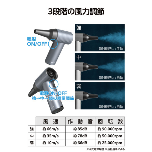 回転数:弱:約25,000rpm、中:約50,000rpm、強:約90,000rpm