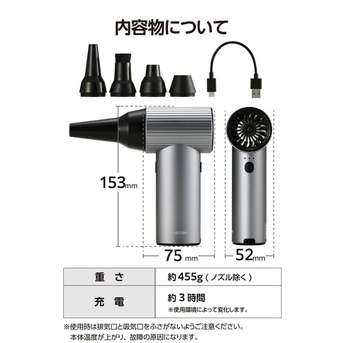 内容物:電動エアダスター本体、噴射ノズル、ブラシ付きノズル、エアーノズル、大口径エアーノズル、USB-A - USB Type-C(TM)ケーブル