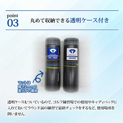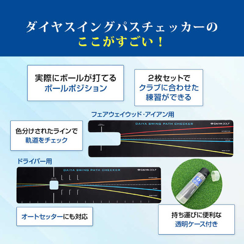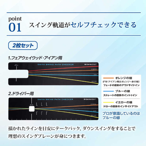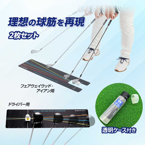 ●ドライバー用、FW/アイアン用のスイング軌道を確認できる2枚セットのスイング練習器具です。● 描かれたラインを目安にテークバック、ダウンスイングをすることで理想の軌道が身につきます。●練習場などで実際にボールを置いて打つことが出来ます。●ドライバー用はオートセッターにも対応しております。●持ち運びに便利な個別ケース付き