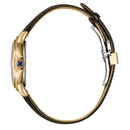 ゆったりとしたデザインのローマ数字インデックスと長いリーフ針が、しなやかさと力強さを表現。