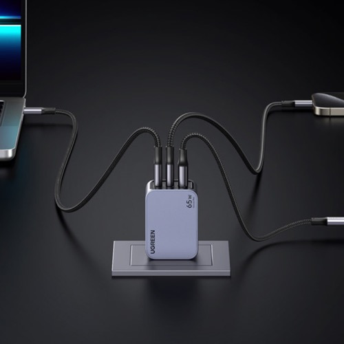 2つのUSB-Cポートと1つのUSB-Aポートを搭載し、最大3台のデバイスの同時充電が可能です。合計65Wの充電が可能なため、スマートフォンやスマートウォッチ、タブレット、ノートパソコンなどの充電に便利です。