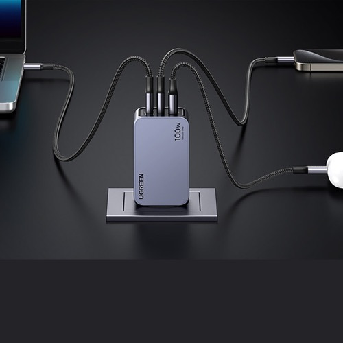 2つのUSB-Cポートと1つのUSB-Aポートを搭載し、最大3台のデバイスの同時充電が可能です。合計100Wの充電が可能なため、スマートフォンやスマートウォッチ、タブレット、ノートパソコンなどの充電に便利です。