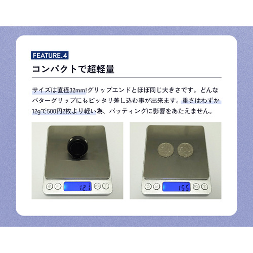 サイズはわずか32?!ボールマーカーとほぼ同じ大きさです。どんなパターグリップにもピッタリ挿し込めるように設計されています。重さはたったの12gで500円2枚より軽い。決してあなたのパッティングを邪魔しません。