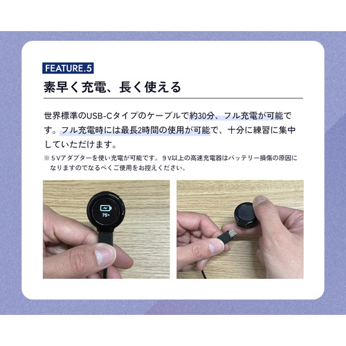 世界標準のUSB-Cタイプのケーブルで約30分、フル充電が可能です。フル充電時に約2時間の使用が可能で十分に練習に集中できます。※5Vアダプターをお使い充電可能です。9V以上の高速充電器かバッテリー損傷の原因になりますので使用しないでください。