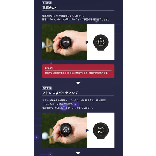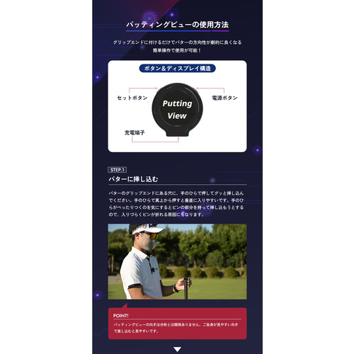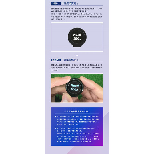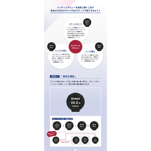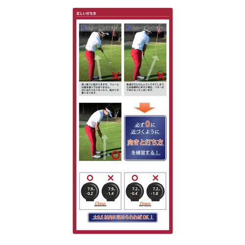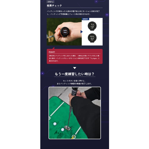 スマホアプリ連動無し!パッティングビューのOLED(有機ELディスプレ)を通して、画面に表示される予想距離をその場で確認しながら、自分だけのパッティング感覚を身に付いていきます。ボールを打つ瞬間のフェース角が画面に表示されるので、画面でチェックしながら正確な練習ができます。