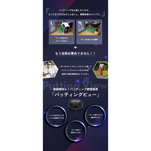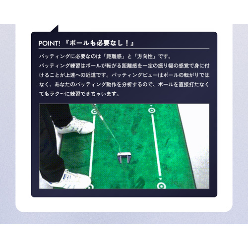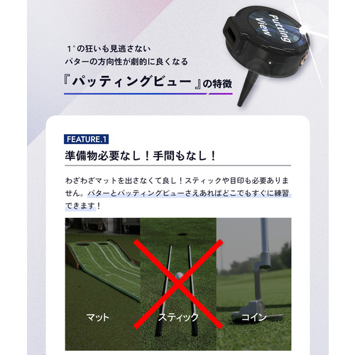 わざわざマットを出さなくてもOK!パターとパッティングビューさえあれば、どこでもすぐに練習できます。ボールが無くてもOK!パッティングに必要なのは「距離感」と「方向性」です。ボールが転がる距離感を一定の振り幅の感覚で身に付けることが上達の近道です。パッティングビューはボールの転がりではなく、あなたのパッティング動作を分析するのでボールを直接打たなくても練習できます。