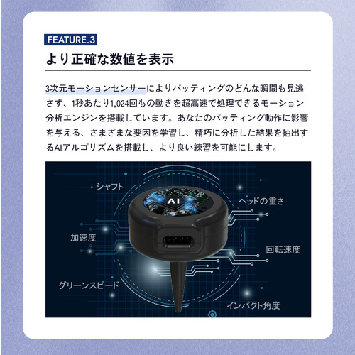 3次元モーションセンサーによりパッティングのどんな瞬間も見逃さず、1秒あたり1,024回もの動きを超高速で処理できるモーション分析エンジンを搭載しています。あなたのパッティング動作に影響を与えるさまざまな要因を学習し、精巧に分析した結果を抽出するAIアルゴリズムを搭載しより良い練習を可能にします。