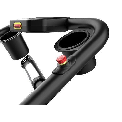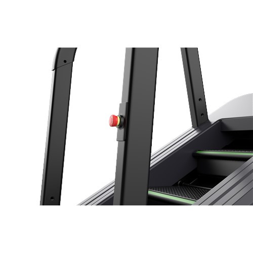操作パネルの中央部のセーフティーキーに加え、ハンドルの上位と下位にもそれぞれ一個の緊急停止ボタンがあります。マシンの下方には赤外線センサーが設けられており、運動中に人が近づいたり、万が一転落した場合マシンを緊急停止します。