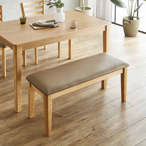 ダイニング4点セット:●テーブルサイズ:幅120×奥75×高70cm。●イスサイズ:幅42×奥50×高80cm。●座面高:43cm。●ベンチサイズ:幅90×奥35×高43cm。●材料:天板MDFオーク突板。●イス:LVL(積層合板)。●ベンチ:ラバーウッド。●座面:PVC(皮革合皮)。●塗装:天板/ウレタン塗装、イス・ベンチ/ラッカー塗装。●生産国:ベトナム。