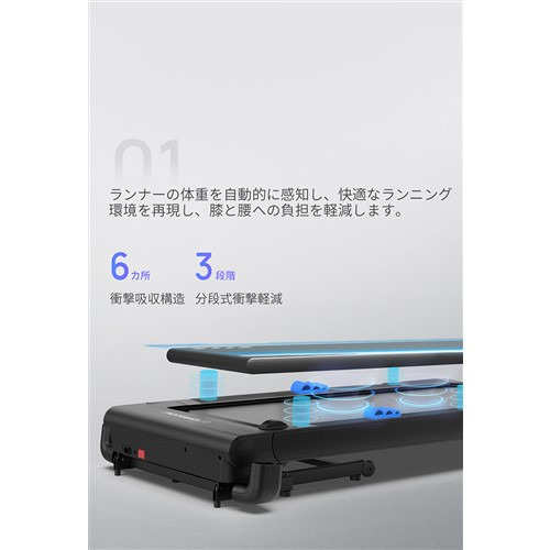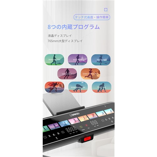 タッチパネル式LEDパネル、Bluetooth通信、MAX:14km/h、傾斜調節10段階、連続使用時間:120分、衝撃吸収構造