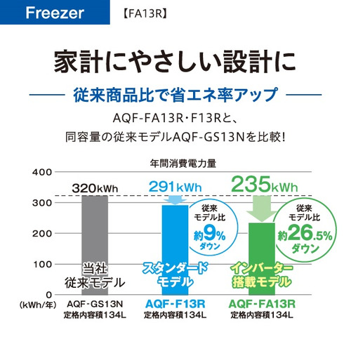 AQUA 冷凍庫 134L 右開き 1ドア 幅50.2cm 省エネ静音 モード切替 ファン式 AQF-FA13R(W) ホワイト系 2025年