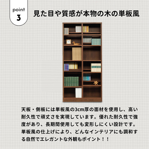 ●すぐに使える完成品で組立不要。●天面、側板面材には単板風の3mm厚の面材使用で高級感があり。●家具の産地【大川市】にて生産。●前後2枚の可動式棚板を同じ高さに設置することによって、奥行が29cmとなり、雑誌やA4サイズの本も収納可能。●可動棚は、16枚付きで自由自在に収納可能。●可動棚耐荷重:10kg。●カラー:ブラウン色。●生産国:日本。