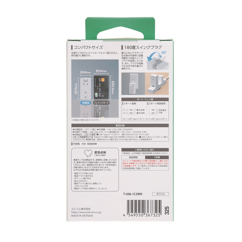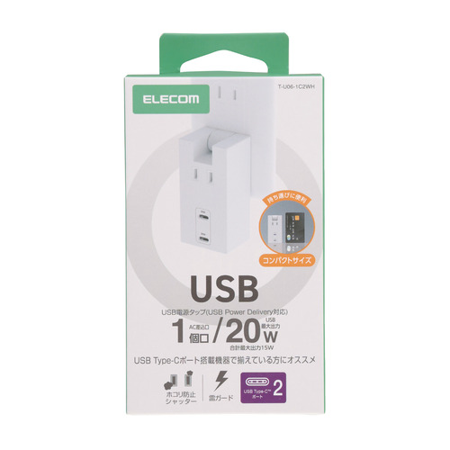 エレコム T-U06-1C2WH 電源タップ USB タップ 直挿し コンセント 1口 Type-C ×2 PD 20W 雷ガード ホワイト