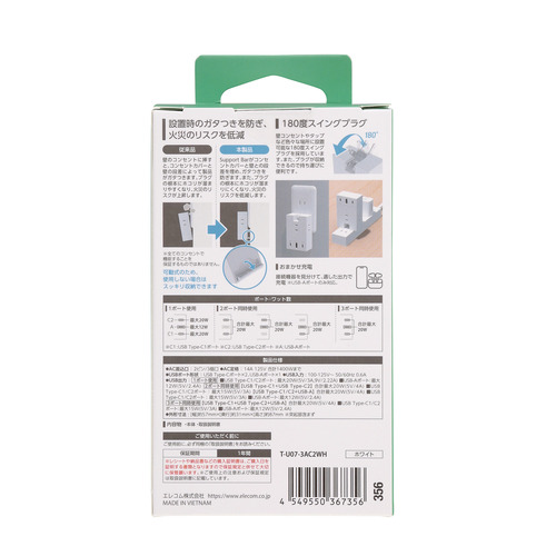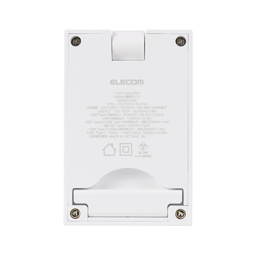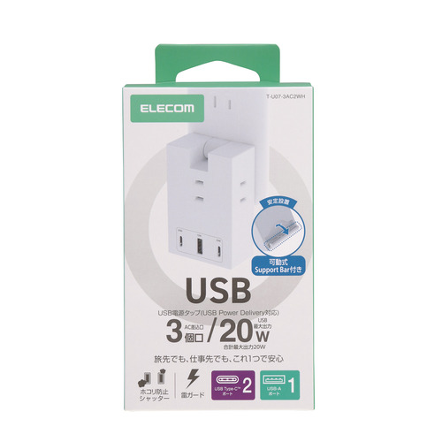 エレコム T-U07-3AC2WH 電源タップ USB タップ 直挿し コンセント 3口 Type-C ×2 USB-A ×1 雷ガード ホワイト