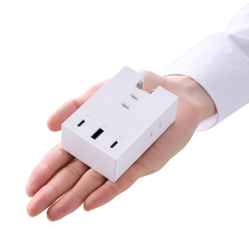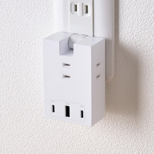 ●ACアダプター不要。スマートフォンやタブレットなどの充電を、これ1台で。3つのAC差込口、1つのUSB-Aポート、2つのUSB Type-C(TM)ポートが一体になったモバイルUSBタップです。最大6台のデバイスを接続でき、コンセントの少ない場所で活躍します。設置時にコンセントカバーと壁との段差でガタつき、プラグが抜けそうになるのを防ぐ「Support Bar」を搭載しています。