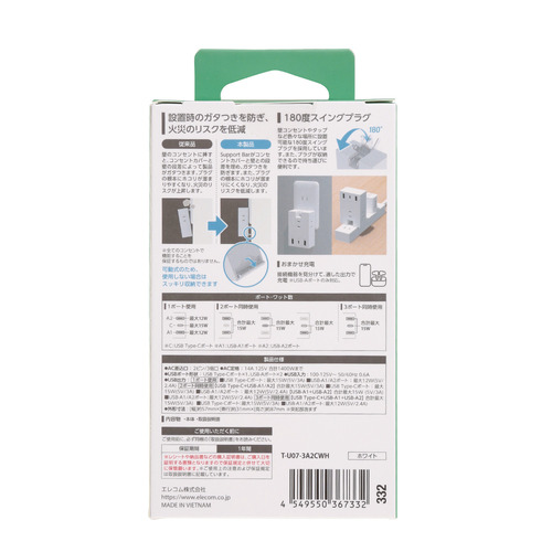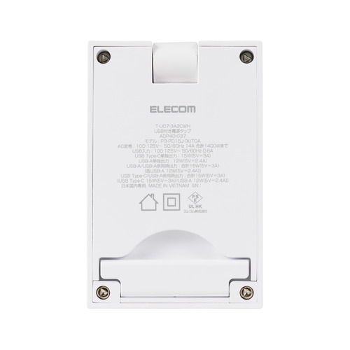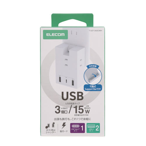 エレコム T-U07-3A2CWH 電源タップ USB タップ 直挿し コンセント 3口 Type-C ×1 USB-A ×2 雷ガード ホワイト