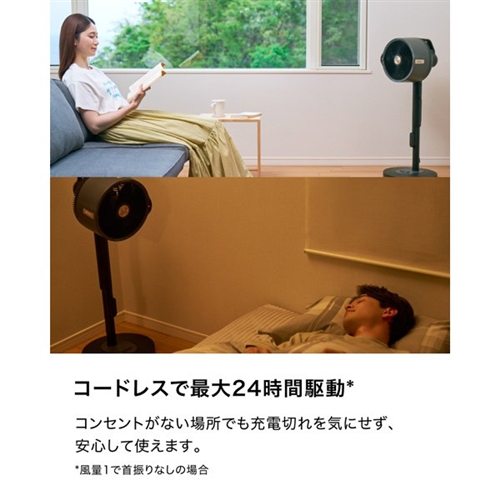 運転時間(コードレス時、首振り及びミストなし):風量1→24時間、風量3→約6時間、風量5→約2時間