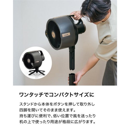 ワンタッチでスタンドから扇風機本体を取り外し、四脚を開いてそのまま使えます。