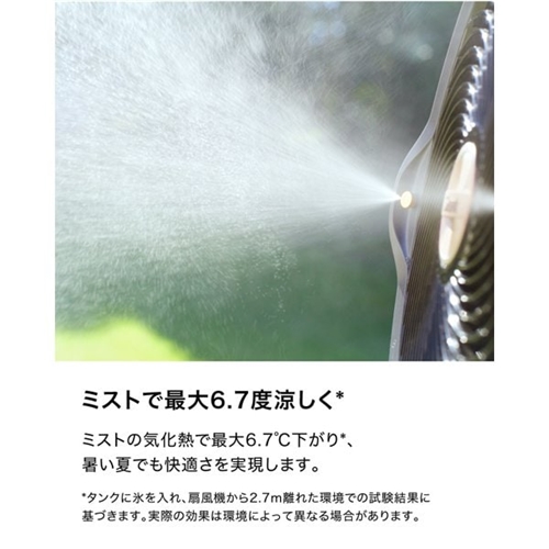 細かな粒子のミストを風と一緒に出せるミスト機能を搭載しており、屋外の生暖かい風に清涼感をプラスすることで、涼しく快適な環境を提供します。