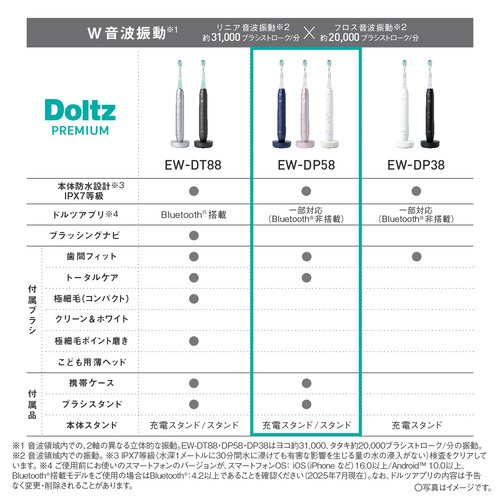 機能:■防水設計 IPX7(※本体はIPX7基準(水深1メートルに30分間水に浸けても有害な影響を生じる量の水の侵入がない)検査をクリアしています。※) ■国内使用のみ(※ Bluetooth搭載に伴い、国内の電波法規のみ遵守した仕様となっているため、海外でのご利用はできません。※)AC100〜240V ■パワーコントロール ■コース記憶機能 ■充電残量表示付 ■充電催促機能 ■磨きポイント切替お知らせ ■ライトリング ■磨き角度センサー ■押しつけ防止センサー・プロ ■動かしすぎ検知 ■USB充電