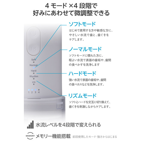 ●ソフトモード:初めて使用する方や歯ぐきの感覚が敏感な方に。やさしい水流で歯と歯ぐきをケアします。