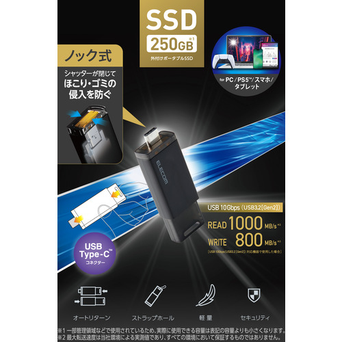 エレコム ESD-ESK0250GBK 外付けSSD 250GB USB3.2 Gen2 USB Type-C ノック式 シャッター機構 mac Windows対応 ブラック