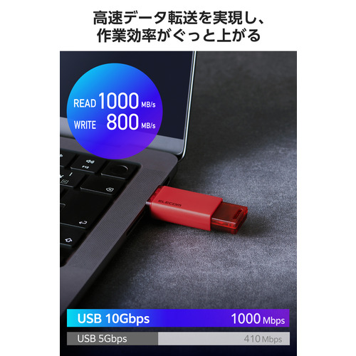 データ転送速度:読み込み:最大1000MB/s、書き込み:最大800MB/s ※当社環境での測定値 ※USB 10Gbps(USB3.2(Gen2))でご使用になるには、機器側がUSB 10Gbps(USB3.2(Gen2))に対応している必要があります。