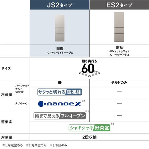パナソニック 冷蔵庫 326L 右開き 3ドア 幅60cm うす型 シンプルデザイン サクッと切れる微凍結 ナノイーX NR-C33JS2-C ベージュ系
