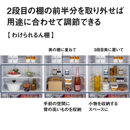 冷蔵室:・全棚ガラストレイ ・わけられるん棚(2段目) ・パーシャル/チルド切替室(LED照明) ・天面照明 ・コントロールパネル 庫内 ・卵収納量15個(ドア棚) ・ボトル棚 収納数ペットボトル1.5L×6本or2L×4本