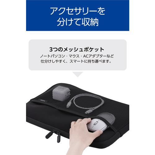 ●ノートパソコンやマウス、ACアダプターなどをスマートに持ち運び可能!3つのメッシュポケット付きで仕分けしやすく、中身も一目でわかります。撥水生地を採用し、飲み物のこぼれや雨からも守れて安心です。