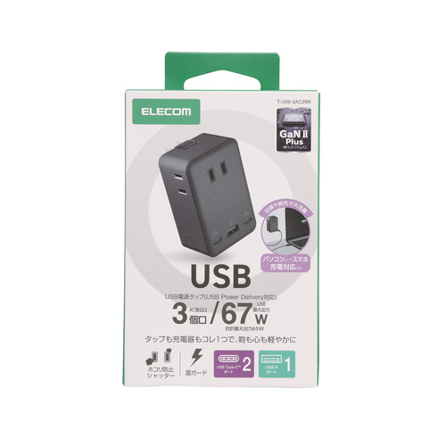 エレコム T-U09-3AC2BK コンセント直挿しUSBタップ(AC3口+67W/USB-A×1+USB-C×2)