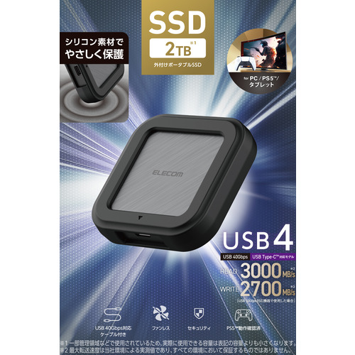 エレコム ESD-EHC2000GBK USB4 40Gbps対応 外付けポータブルSSD 2TB 最大読込3000MB/s ブラック