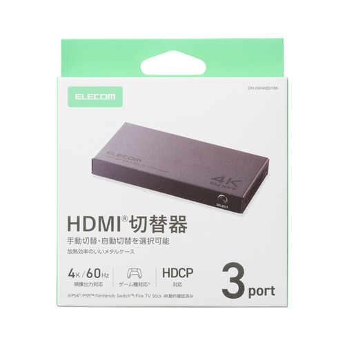 エレコム DH-SW4KB31BK HDMI切替器(3入力1出力・4K60Hz)