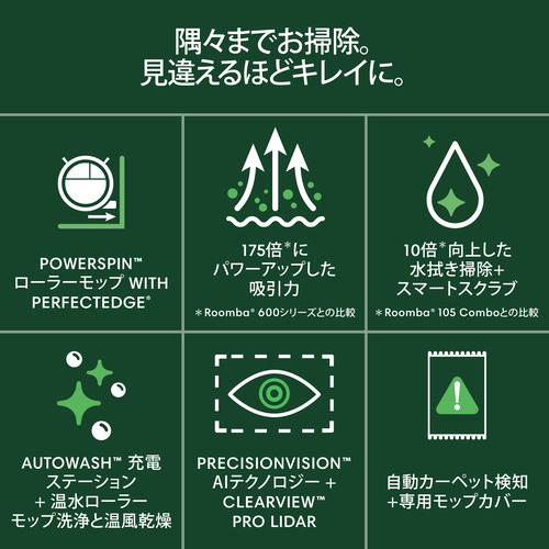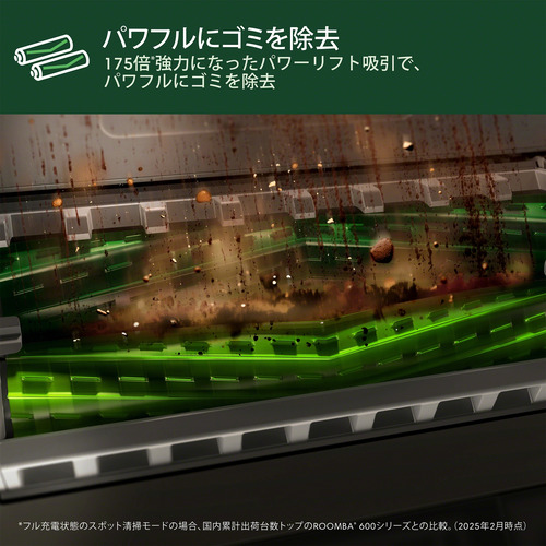 従来比175倍の吸引力でごみを除去(Roomba600シリーズと比較、フル充電スポット清掃時)