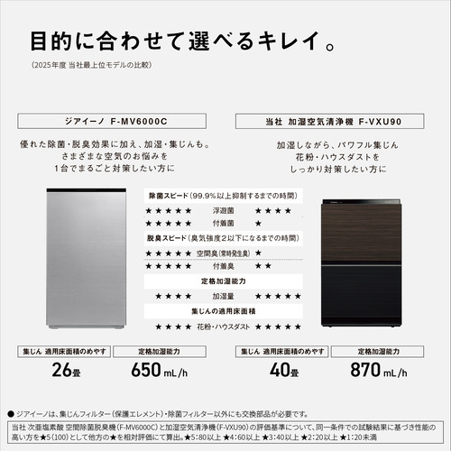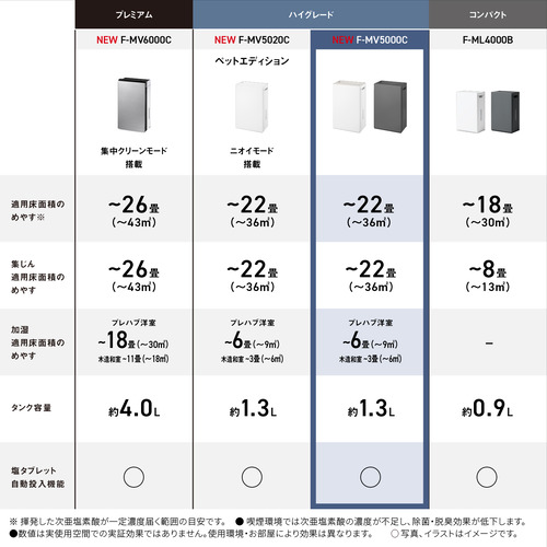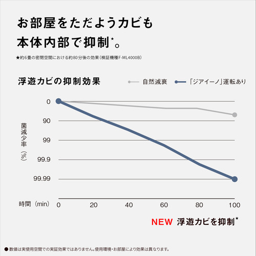 ・ペットフードや加齢臭、カビ臭への脱臭効果を確認 ・本体内でカビ菌を除菌(★浮遊カビの場合。本体内の次亜塩素酸水溶液による、約6畳の密閉空間、約80分後の効果(検証機種:F-ML4000B★)、カビ臭を脱臭(★喫煙環境では次亜塩素酸の濃度が不足し、除菌・脱臭効果が低下します。★)(★脱臭効果は、周囲環境(温度、湿度)、運転時間、臭気によって異なります。★)