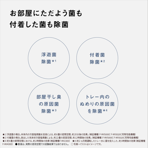 ・ペットフードや加齢臭、カビ臭への脱臭効果を確認 ・本体内でカビ菌を除菌(★浮遊カビの場合。本体内の次亜塩素酸水溶液による、約6畳の密閉空間、約80分後の効果(検証機種:F-ML4000B★)、カビ臭を脱臭(★喫煙環境では次亜塩素酸の濃度が不足し、除菌・脱臭効果が低下します。★)(★脱臭効果は、周囲環境(温度、湿度)、運転時間、臭気によって異なります。★)