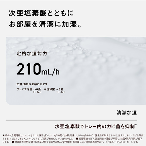 加湿量(※加湿量、適用床面積は「日本電機工業会規格(JEM1426)」に基づく、室温20度・湿度30%の場合です。室内の温度や湿度によって、加湿量、連続運転時間は変わります。※):強 210mL/h、中 120mL/h、弱 50mL/h