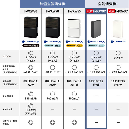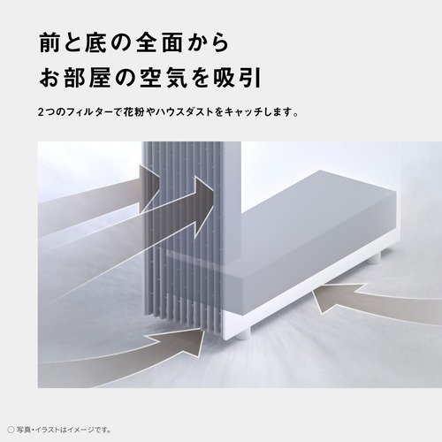 ●設置面積1/2(当社比)(★加湿機能はありません。★)(※【比較条件】当社同風量帯における機種での設置面積との比較。【設置面積】23年発売F-VXW70 1,023cm2、25年発売F-PX70C 475cm2※)で、パワフルに集じん前と底のL字全面吸引とパワフル、かつ大風量の直進気流で、集じん量15%アップ(★ 設置条件には、一部制約があります。どの設置場所や向きでも同じ清浄効果を保証するものではありません。★)(※【試験条件】18畳の試験空間で花粉相当の粉じんの時間当たりの集じん量を比較。本体を壁の中央に設置し、製品正面にて花粉相当の粉じんを噴霧。【運転モード】23年発売F-VXW70 自動運転モード[花粉]の最大風量、25年発売F-PX70C 自動運転モードの最大風量 【試験結果】F-VXW70 175個/sec、F-PX70C 202個/sec。※)