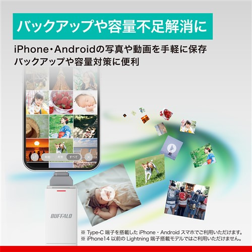 本商品は、バッファローアプリ「写真バックアップ」(無料)に対応。大切な思い出をもっと簡単に保存できます。iPhoneのUSB-C端子に接続するだけで、写真やビデオを本商品へスムーズにバックアップ。「写真バックアップ」アプリなら、保存したデータの閲覧や復元もかんたんに行えます。※対応機種:USB-C端子搭載のiPhone/iPad(Android端末は非対応)※使用前に本商品のフォーマット等が必要な場合がございます。