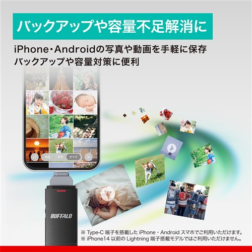 本商品は、バッファローアプリ「写真バックアップ」(無料)に対応。大切な思い出をもっと簡単に保存できます。iPhoneのUSB-C端子に接続するだけで、写真やビデオを本商品へスムーズにバックアップ。「写真バックアップ」アプリなら、保存したデータの閲覧や復元もかんたんに行えます。※対応機種:USB-C端子搭載のiPhone/iPad(Android端末は非対応)※使用前に本商品のフォーマット等が必要な場合がございます。