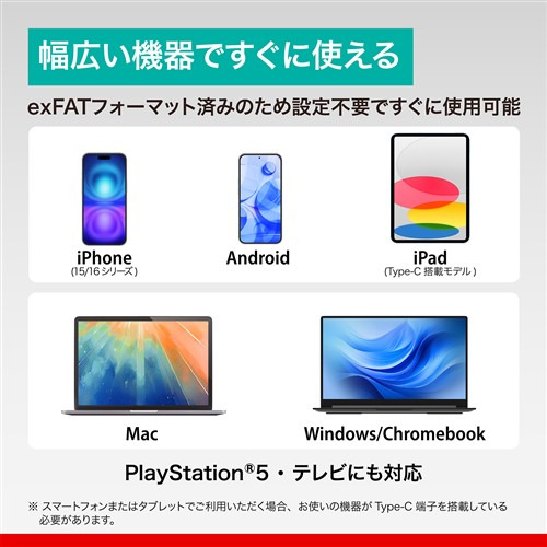 本商品は USB Type-A端子とUSB Type-C端子の両方を備えています。出荷時にexFATでフォーマット済み。パソコンだけでなく、スマホやタブレット等さまざまな機器で、フォーマットや変換アダプター無しでそのまま使用できます。