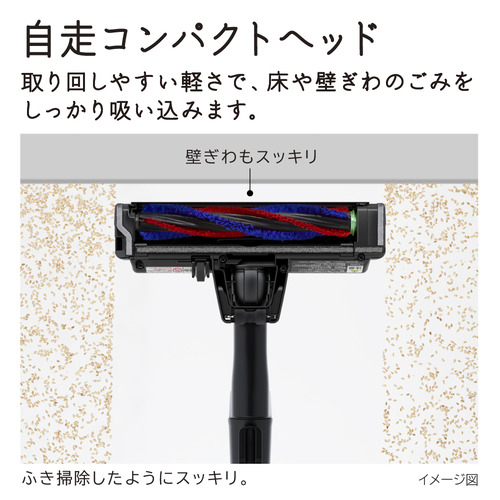 自走コンパクトヘッド」は、自走機能により軽い力でスイスイ前に進み、軽い操作でごみをしっかり吸い込みます。また、回転ブラシの先端をループ形状にした「からまんブラシ」を採用することで、髪の毛などがからまりにくく、すっきり吸引。お手入れもラクです。
