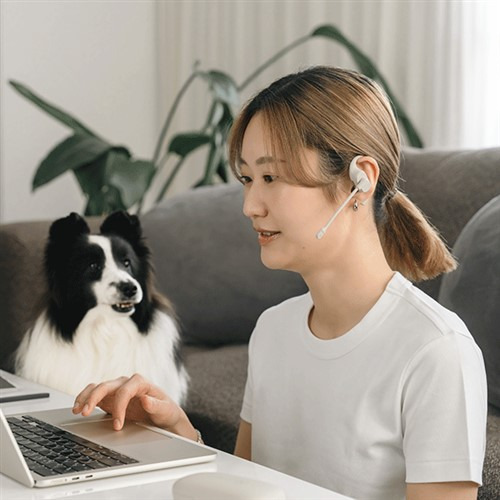 本製品は、高性能な「AIノイズバリアマイク」により、周囲の環境音を強力に抑制します。これにより、周りの声が気になる騒がしいオフィス・カフェ、出勤時間帯の混雑した駅、または子どもや愛犬などの他の生活者がいるリビングなど、例え真横で話している人がいたとしても、通話やオンライン会議の相手には背景のノイズはほとんど聞こえず、まるで静かな場所から話しているかのように、あなたの「声だけ」を正確に伝えることが可能です。また、付属のブームマイクを装着することにより、この効果はさらに高まります。
