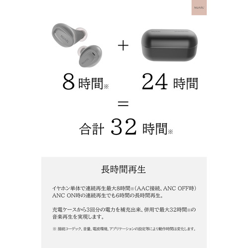 イヤホン単体で連続再生最大8時間(ANC OFF時)、ANC ON時の連続再生でも6時間の長時間再生。充電ケースとの併用で最大32時間の音楽再生を実現します。