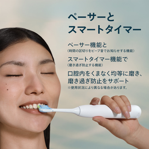 ペーサー機能は、20秒毎に時間の区切りをビープ音でお知らせし、口腔内を一定の間隔で均等にくまなくブラッシングするサポートをします。スマートタイマー機能は、2分間のブラッシング時間が経過すると自動的に停止する機能です。しっかり2分間磨けると同時に、磨き過ぎを防止します。